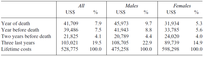 Table 1: Spending in the last years of life as a percentage of lifetime spending (Karlsson, Klein, Ziebarth, 2016).