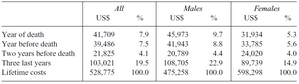 In one of our research projects (Karlsson et al., 2016) that is related to population ageing we provide evidence on how health care spending evolves in the years before death in Germany. For this we use claims panel data from a big German private health insurer to provide detailed individual-level evidence on medical spending between 2005 and 2011. Our main findings are that health care spending more than doubles between ages 50 and 80 and that spending is very concentrated: the top 10 per cent of all spenders are responsible for 53 per cent of all medical spending in a given year. There is a 50 per cent probability that individual expenditures lie in the same quintile of the distribution after five years, for both very-high- and very-low-cost individuals. Medical spending in the year of death is six times higher for the deceased than for everybody else in that year and accounts for 7.9 per cent of lifetime spending (see Table 1). Females use more office-based care and have higher spending at younger ages, whereas males have higher spending at older ages, particularly for hospital care, and die younger.