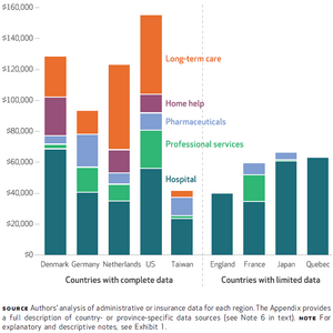Figure 1: Mean per capita medical expenditure (in 2014 US dollars) in 9 countries in the last 3 calendar years of life, by category (Karlsson et al., 2017).